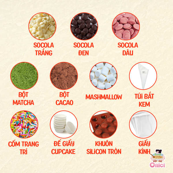 Cũng nhờ set socola bomb của Onici Oheasy nên làm rất nhanh và gọn. Không cần chuẩn bị thêm bất cứ dụng cụ nào vì trong set đã có sẵn khuôn silicon, găng tay, túi bắt kem, túi đựng, topping trang trí và đủ nguyên liệu từ socola trắng, socola đen cho đến socola nút áo vị dâu. Bộ set còn có cốm màu, marshmallow, bột cacao, bột matcha, bọc kiếng, đế giấy cupcake và tờ hướng dẫn chi tiết để ai cũng làm được.