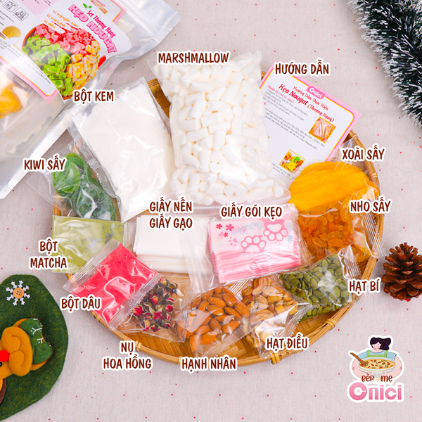 🎏 Chỉ cần một set nguyên liệu tiện lợi bên Onici gồm: marshmallow chuyên dụng nấu kẹo, bột sữa nguyên kem Đức, dâu tây sấy giòn, cánh hoa hồng khô, nho vàng khô, hạt điều rang nguyên hạt, hạt hạnh nhân nguyên hạt, ruột hạt bí xanh, túi đựng kẹo thành phẩm, bột matcha – bột dâu tạo hương và màu, tờ hướng dẫn chi tiết; và nhớ chuẩn bị thêm bơ Tường An hoặc bơ lạt là làm kẹo Nougat được ngay nha!
