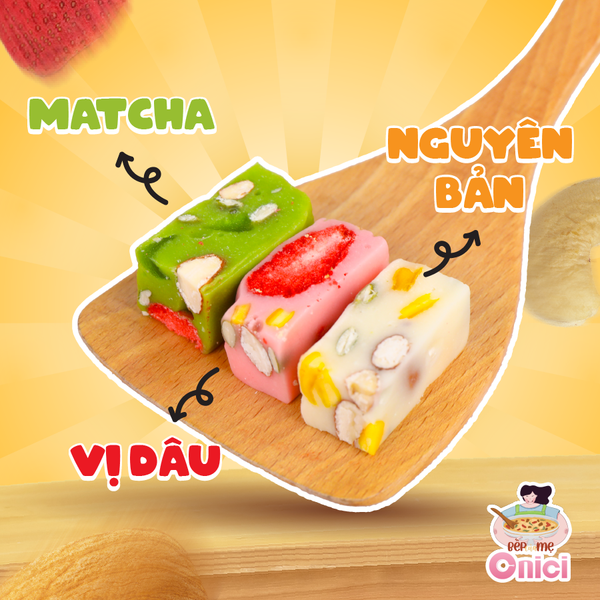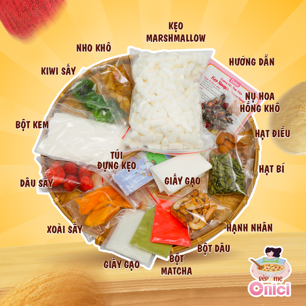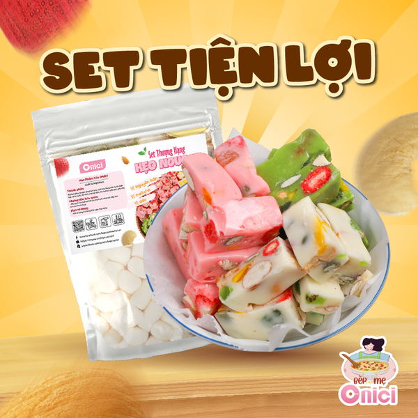 ✨ Có những buổi chiều chỉ cần đứng trong bếp, bật bếp lên nấu kẹo Nougat là thấy lòng nhẹ hẳn. Mùi sữa béo quyện với marshmallow tan chảy, đảo tới đâu là thơm tới đó. Khi kẹo nguội, cắt ra từng miếng dẻo mềm, xen lẫn hạt điều – hạnh nhân giòn bùi cùng trái cây sấy chua ngọt nhẹ, nhìn thôi cũng đủ thấy “đáng công làm”. 🎊 Nị chọn set Nougat Onici Oheasy vì mọi thứ đã được chuẩn bị sẵn gọn gàng, từ marshmallow chuyên dụng nấu kẹo, bột sữa nguyên kem Đức, hạt điều rang và hạt hạnh nhân nguyên hạt, nho vàng, dâu tây sấy giòn, cánh hoa hồng khô, ruột hạt bí xanh cho tới matcha và dâu để tạo hương – tạo màu. Trong set còn có sẵn túi đựng kẹo thành phẩm và tờ hướng dẫn chi tiết nên ai làm cũng dễ thành công, không cần khuôn hay máy móc gì phức tạp. Chỉ cần chuẩn bị thêm chút bơ Tường An hoặc bơ lạt, thao tác vài bước đơn giản là có ngay mẻ kẹo Nougat nhà làm thơm béo, sạch sẽ, ăn cùng gia đình, đãi khách hay gói vài túi nhỏ đem tặng đều hợp, vì Nougat tự tay làm lúc nào cũng mang cảm giác ấm áp và chân thành hơn hẳn mua sẵn bên ngoài.