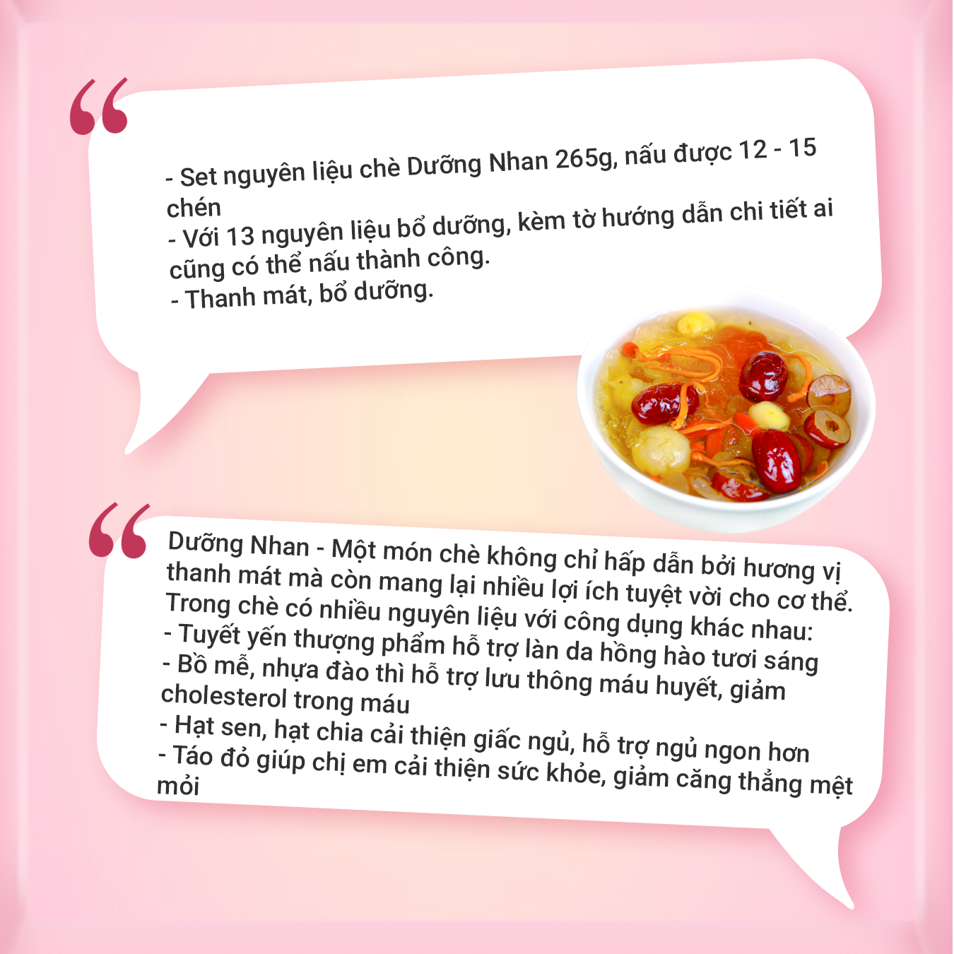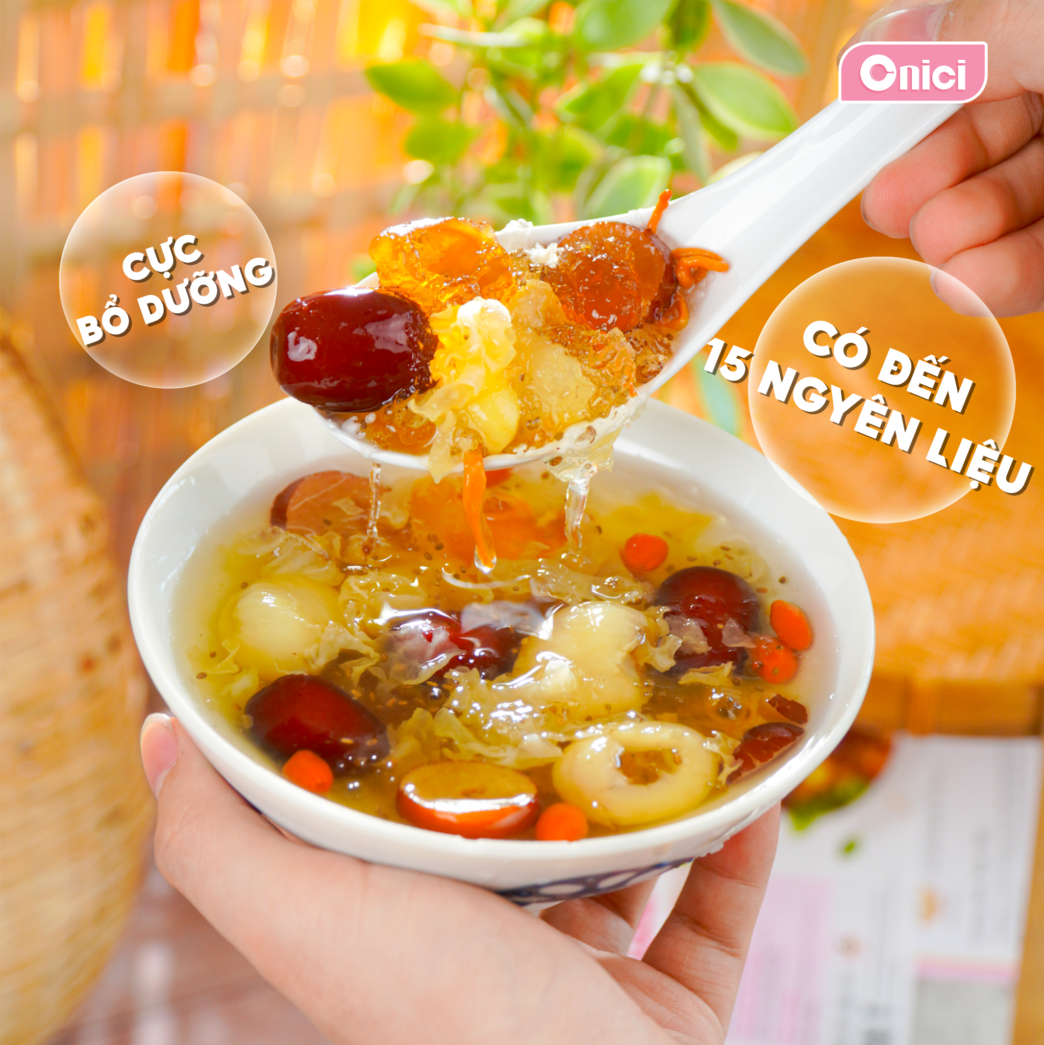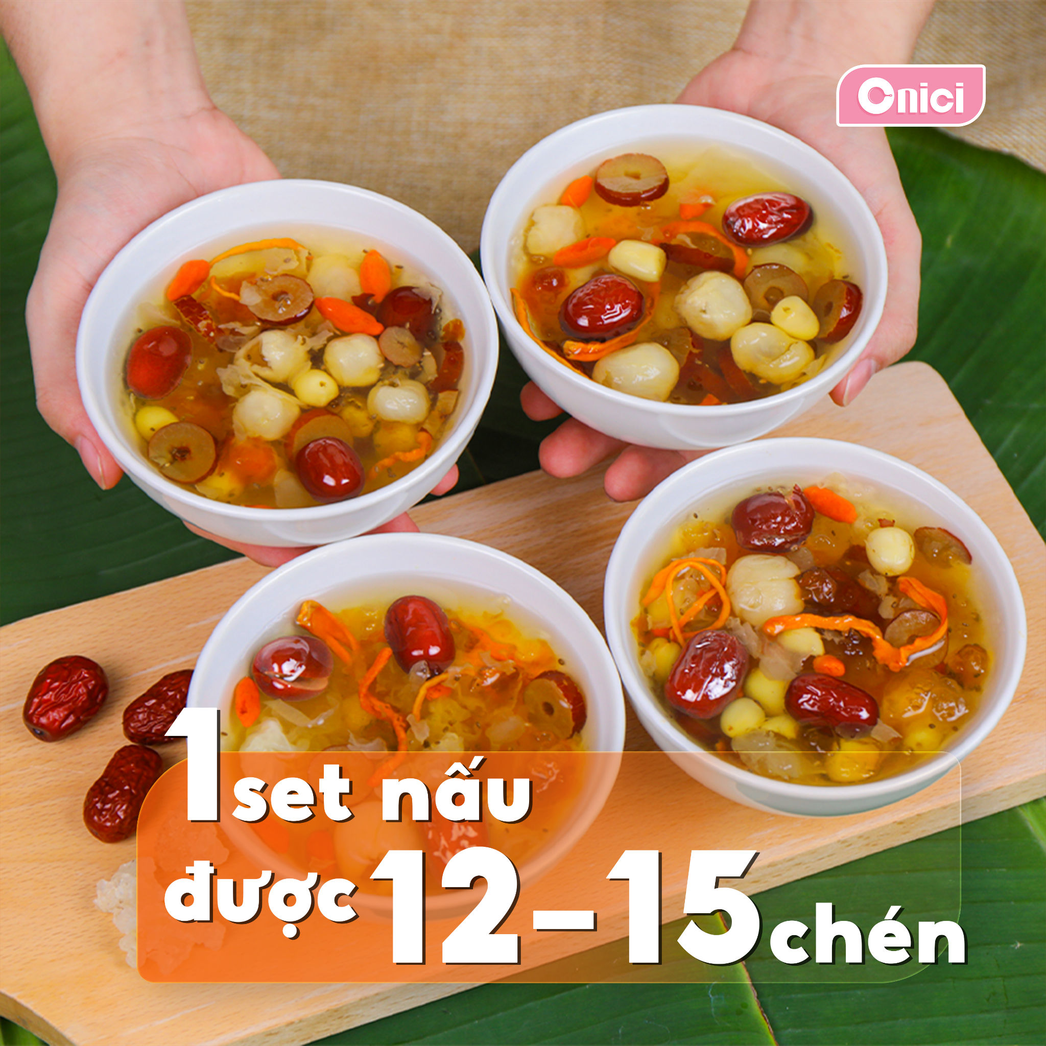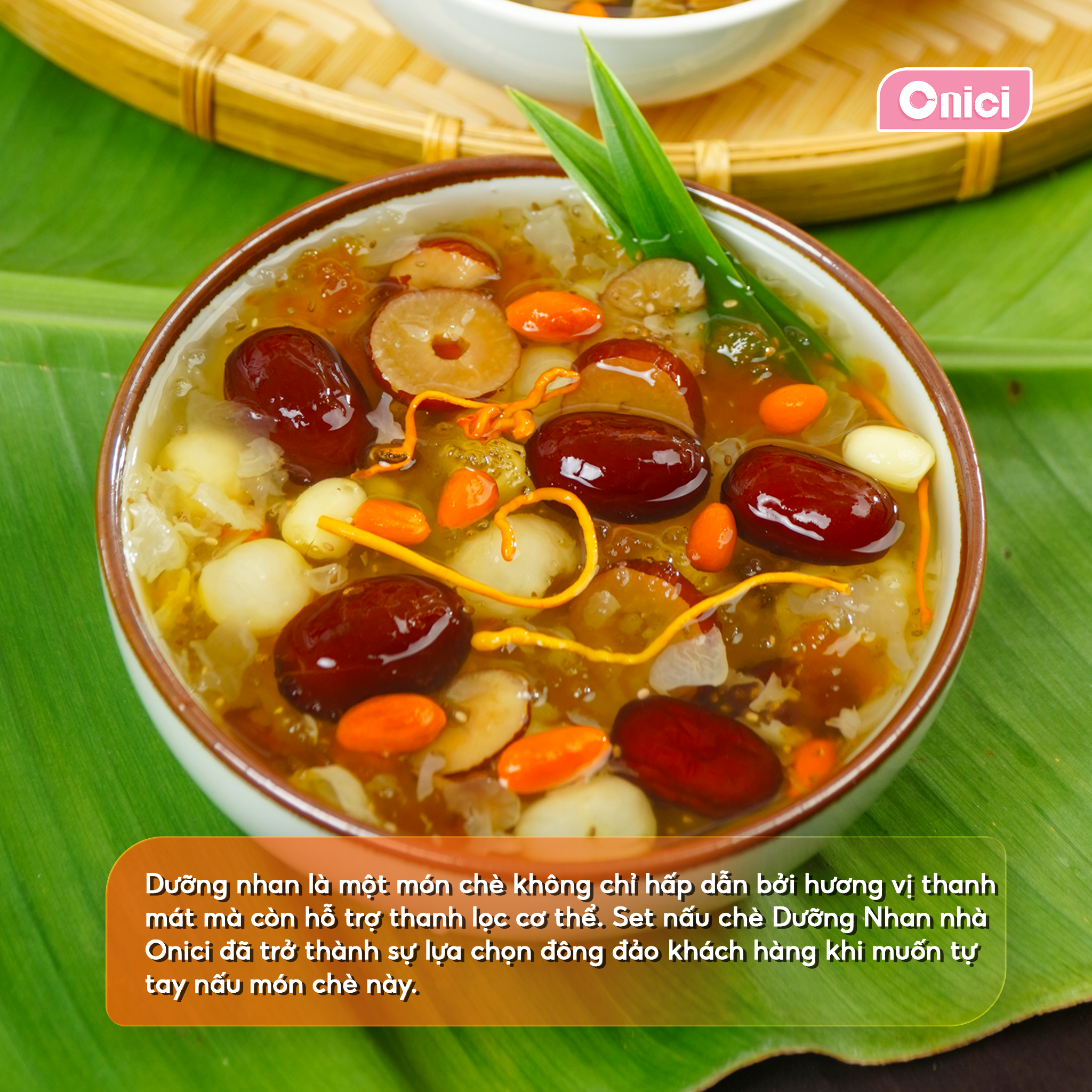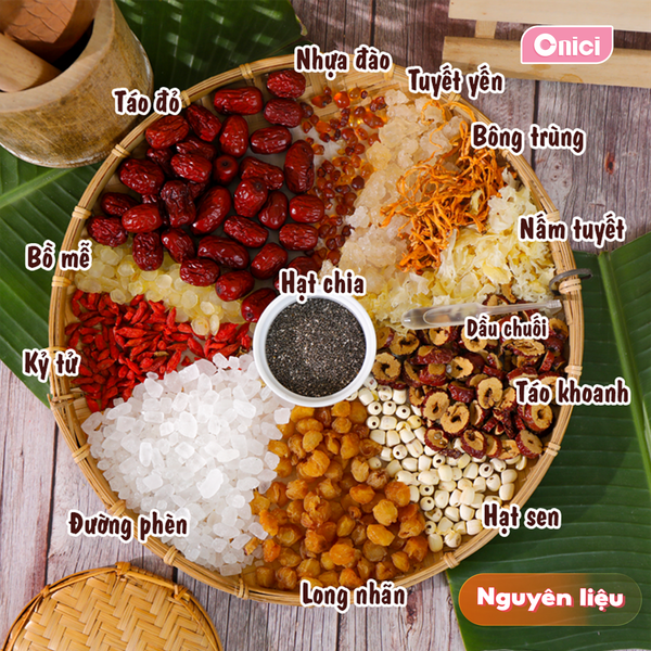 Chè Dưỡng Nhan – món chè thanh mát vừa ngon vừa tốt cho sức khỏe. Với 13 nguyên liệu thảo mộc quý như tuyết yến, bồ mễ, nhựa đào, hạt sen, hạt chia, táo đỏ… giúp làm sáng da, cải thiện giấc ngủ, lưu thông máu và giảm căng thẳng. Kèm công thức nấu đơn giản, set nấu chè Dưỡng Nhan Onici là lựa chọn hoàn hảo để tự tay thưởng thức món chè bổ dưỡng tại nhà.
