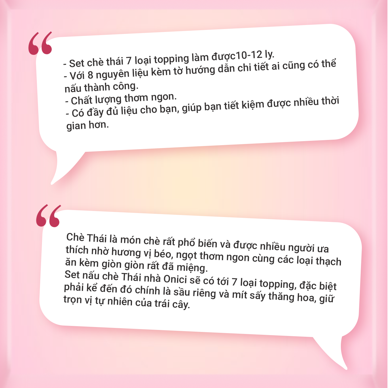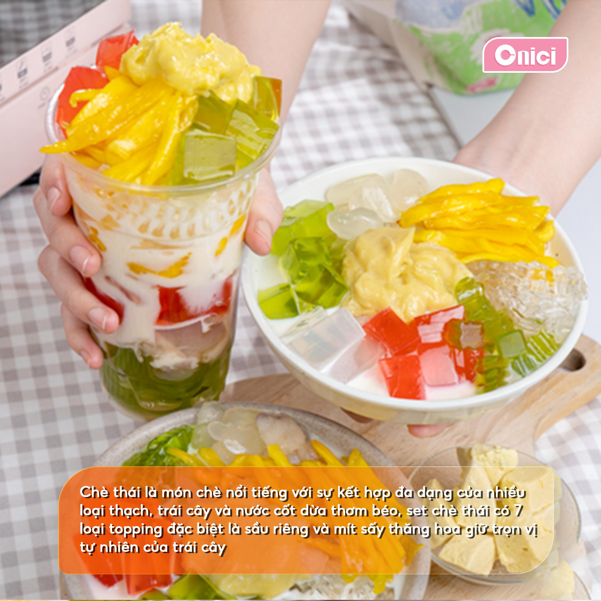 Nếu bạn đang tìm công thức nấu chè Thái chuẩn vị, đây chính là lựa chọn hoàn hảo. Bếp Của Mẹ Onici ra mắt set nguyên liệu làm chè Thái đầu tiên trên thị trường, bao gồm đầy đủ nguyên liệu và tờ công thức chuẩn, đảm bảo nấu là thành công ngay từ lần đầu. Set chè Thái có 7 loại topping, nổi bật nhất là sầu riêng và mít sấy, giữ trọn hương vị tự nhiên, thơm ngon của trái cây.