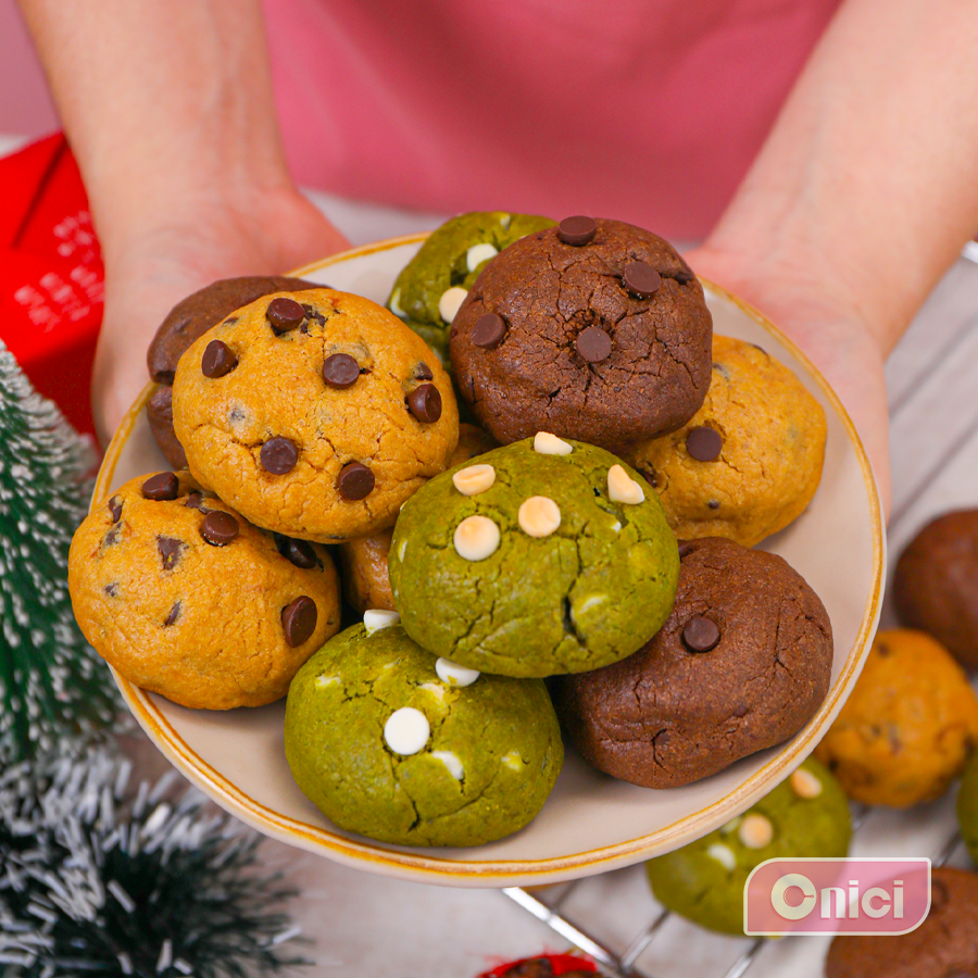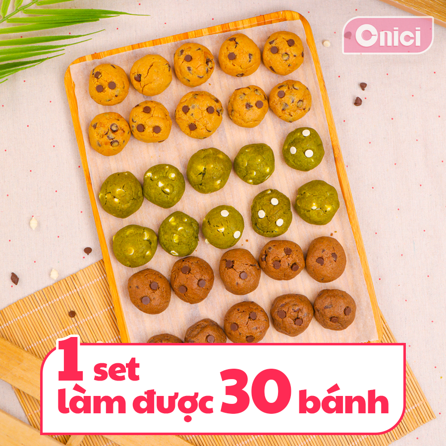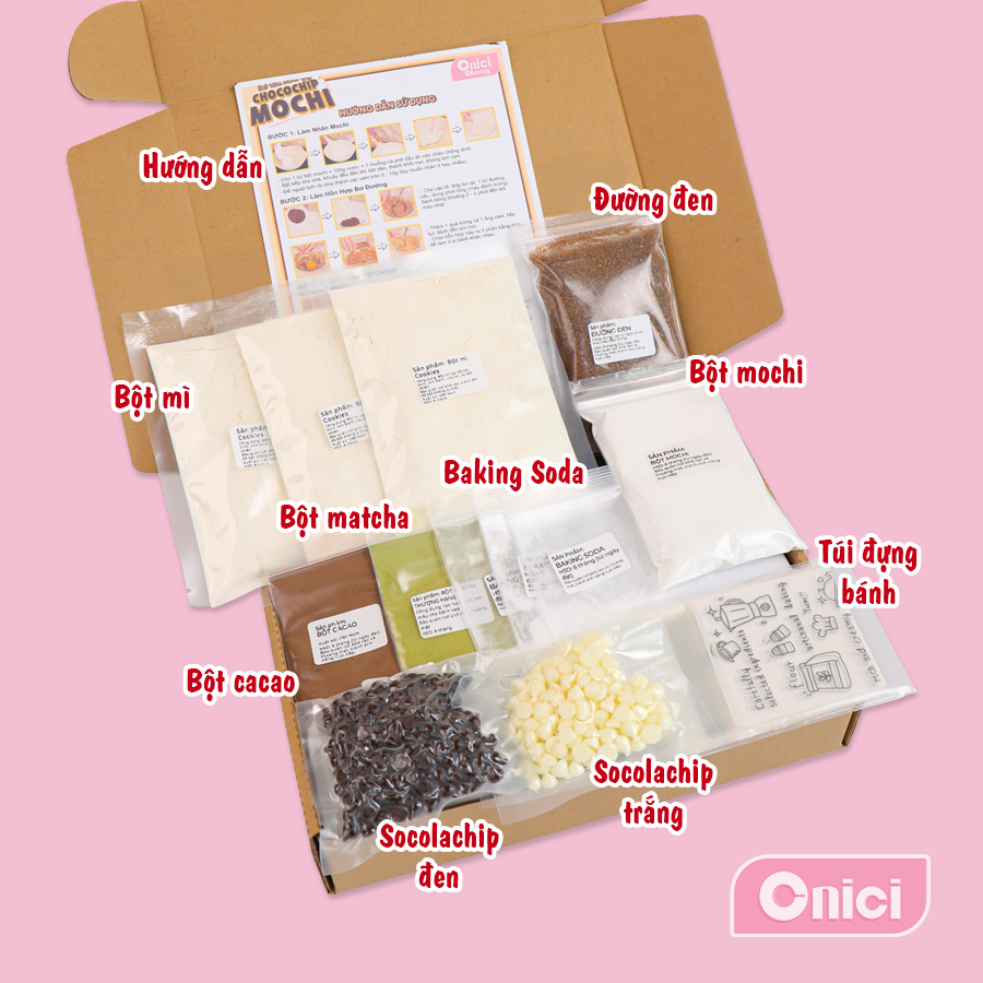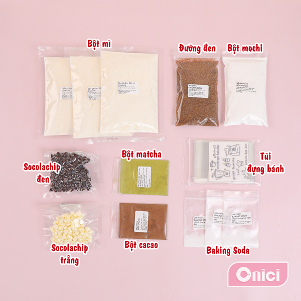 | SET LÀM BÁNH CHOCOCHIP MOCHI 3 VỊ, 30 CÁI | | BẾP CỦA MẸ ONICI Bánh quy choco chip mochi vừa cắn đã thấy lớp vỏ giòn nhẹ, bên trong mochi dẻo mềm, ngọt vừa. Ba vị rõ rệt: cacao đậm thơm, matcha thanh nhẹ, truyền thống béo thơm dễ ăn. Muốn làm tại nhà cho chuẩn vị, chỉ cần dùng set nguyên liệu Onici Oheasy là đủ -------------------------- *Nguyên liệu bao gồm: - bột mì - bột mochi - bột matcha - bột cacao - baking soda - sôcla chip trắng - Socola chip đen - đường den - túi đựng cookie - tờ hướng dẫn cách làm --------------------------