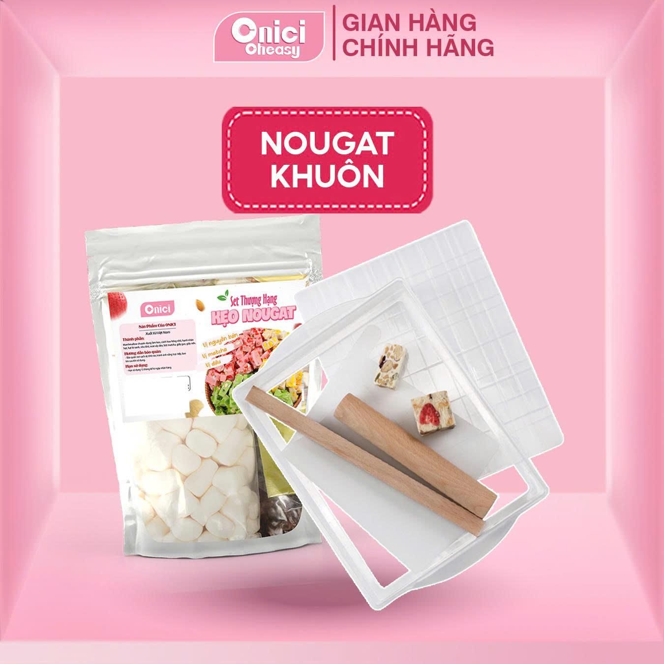 Combo set kẹo nougat Onici Oheasy giúp bạn tự làm kẹo tại nhà cực tiện. Set gồm nguyên liệu nougat chia sẵn và bộ khuôn, chỉ cần làm theo hướng dẫn là ra kẹo dẻo mềm, béo thơm, cắt miếng đẹp mắt, phù hợp ăn vặt hoặc làm quà tặng.