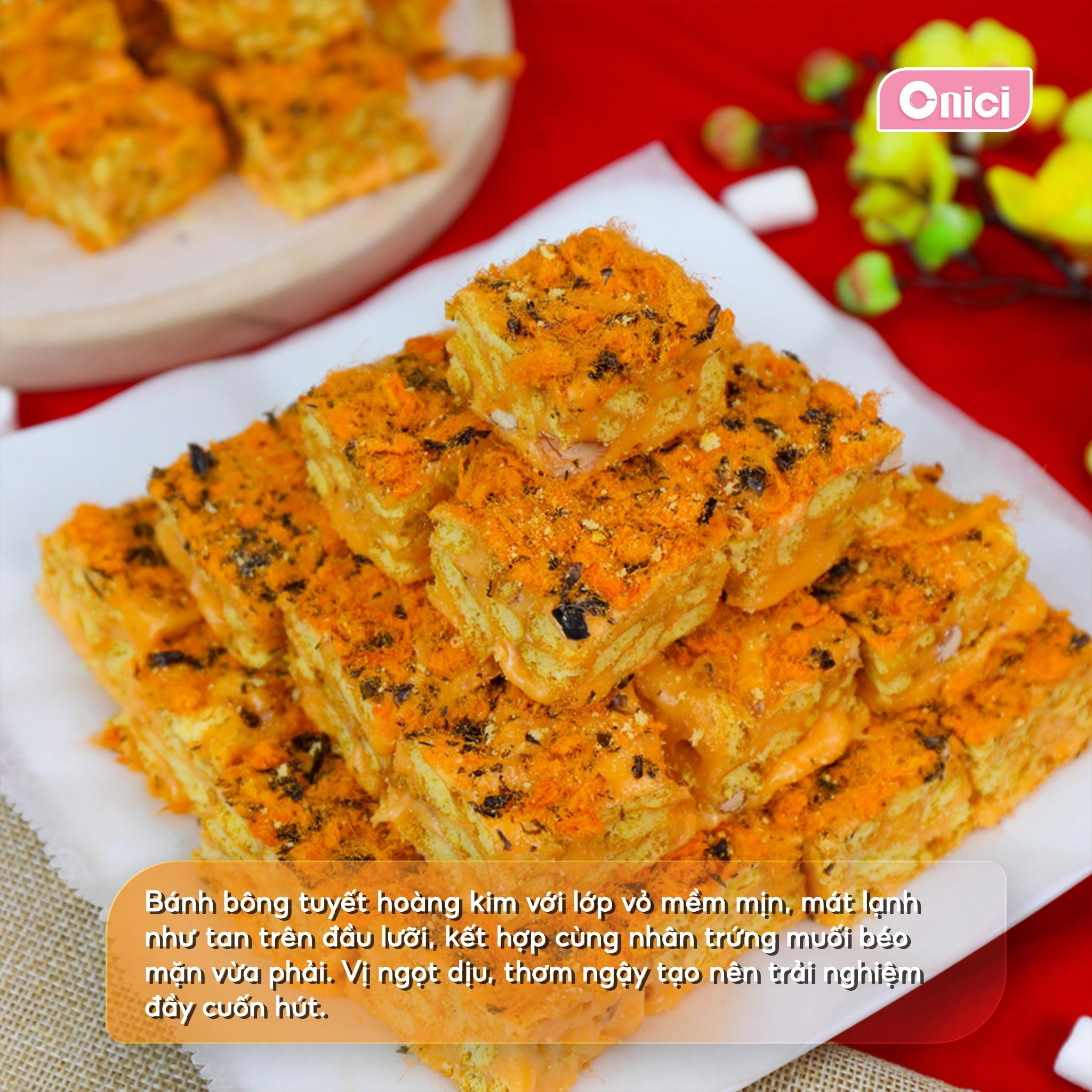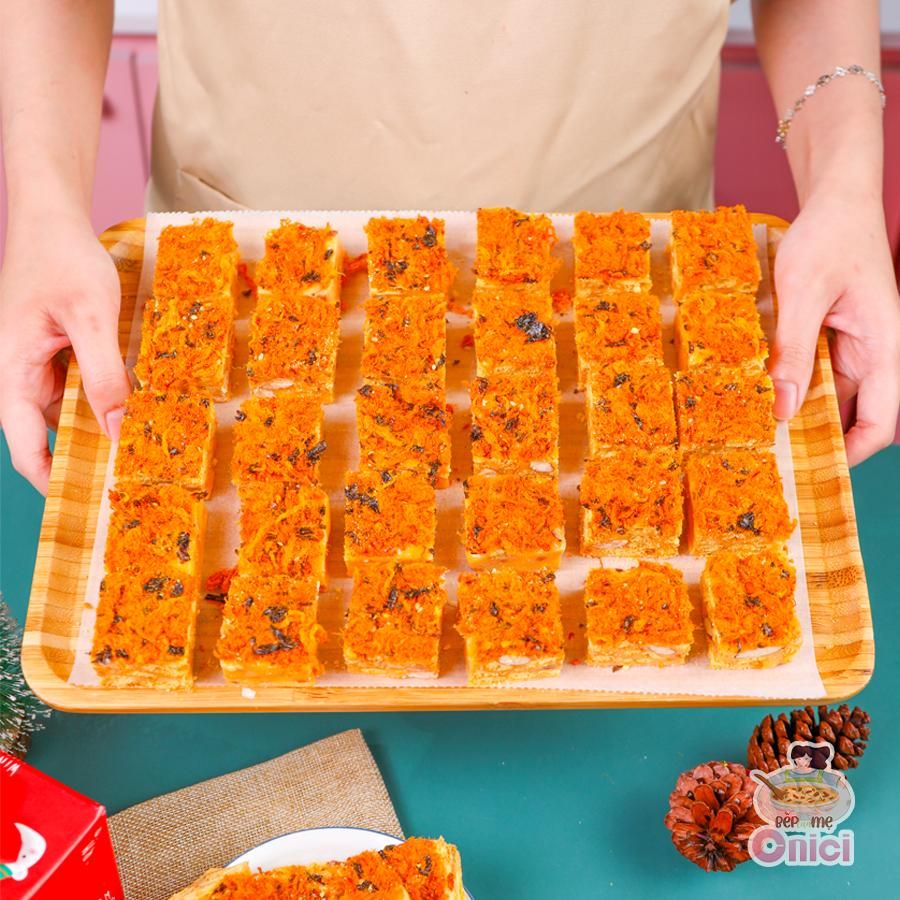 Bánh bông tuyết hoàng kim là sự kết hợp đầy tinh tế giữa các hương vị đối lập nhưng vô cùng ăn ý. Bánh quy cá mặn giòn tan hòa quyện với lớp kẹo marshmallow mềm mịn, thêm chút béo ngậy từ trứng muối. Lớp chà bông gà cay cay cùng rong biển thơm ngon trên bề mặt bánh tạo nên một món ăn độc đáo, hấp dẫn cho bất kỳ dịp lễ nào trong năm.
