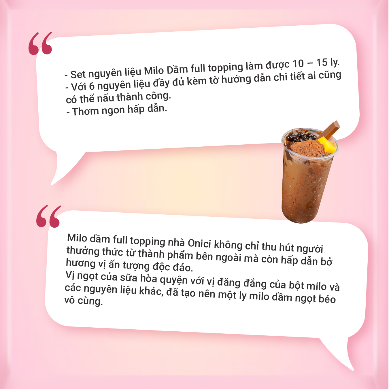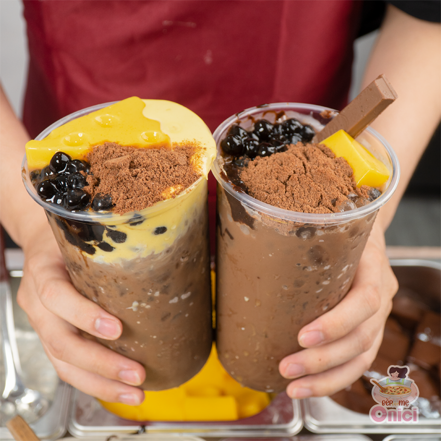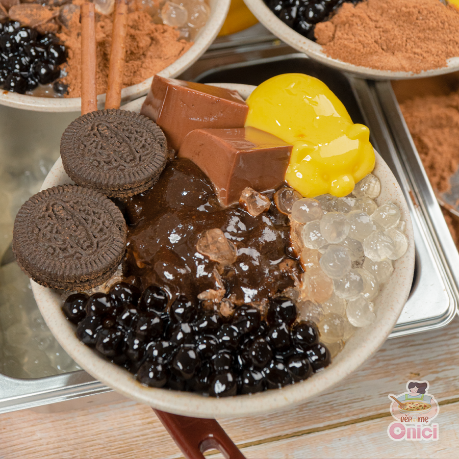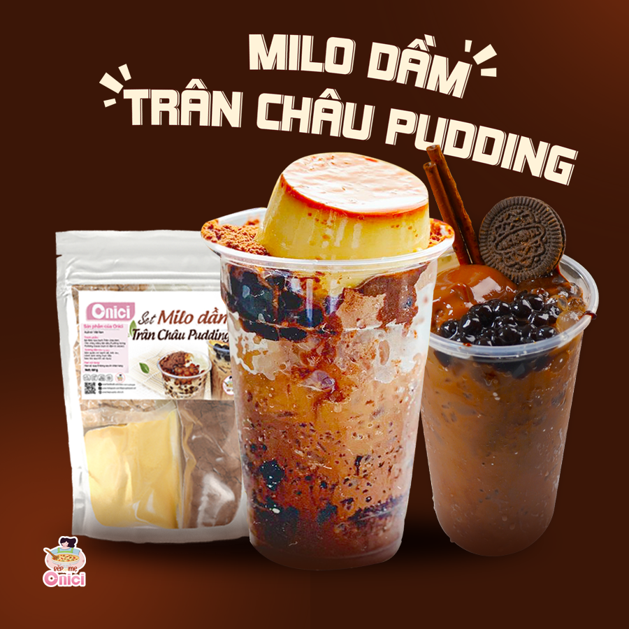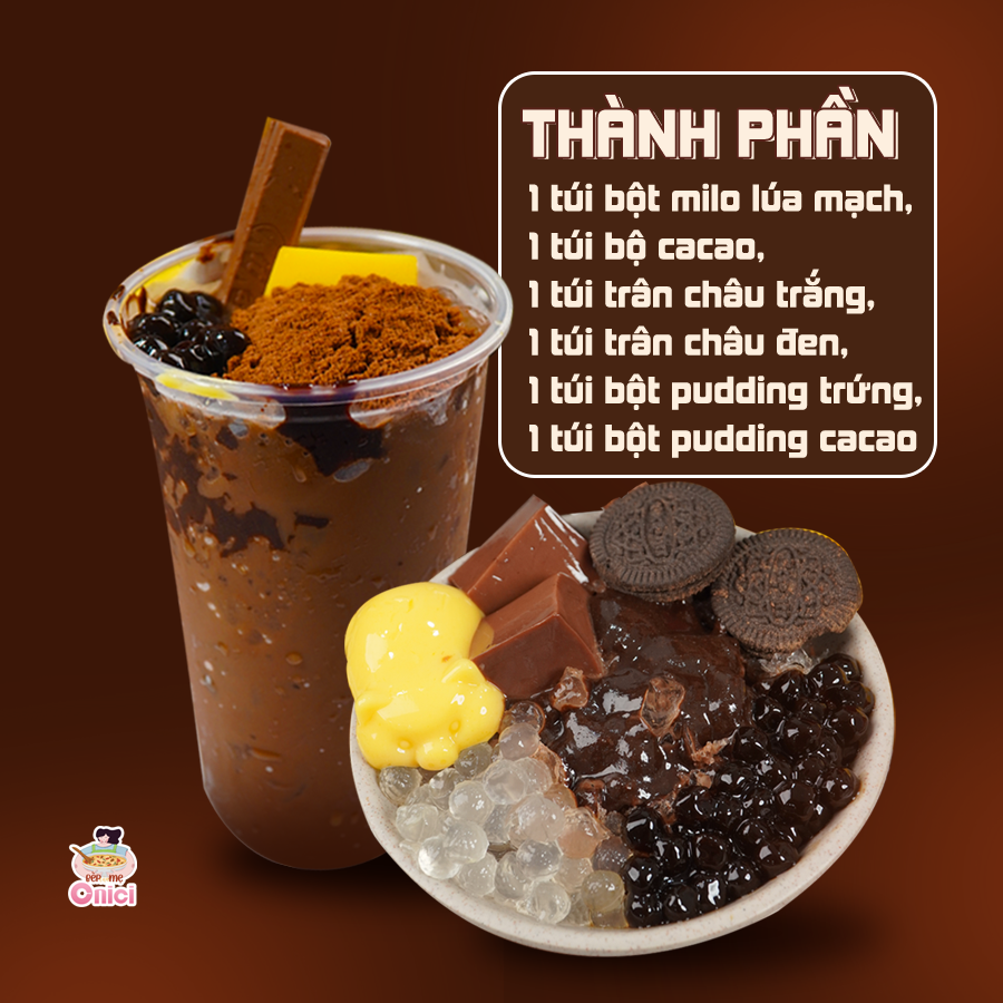 Milo dầm full topping nhà Onici vừa bắt mắt vừa ngon tuyệt với vị ngọt vừa phải, chút đắng cacao và topping đa dạng như trân châu trắng, trân châu đen, pudding socola. Dễ làm ngay tại nhà với set nấu đầy đủ nguyên liệu và công thức chuẩn.