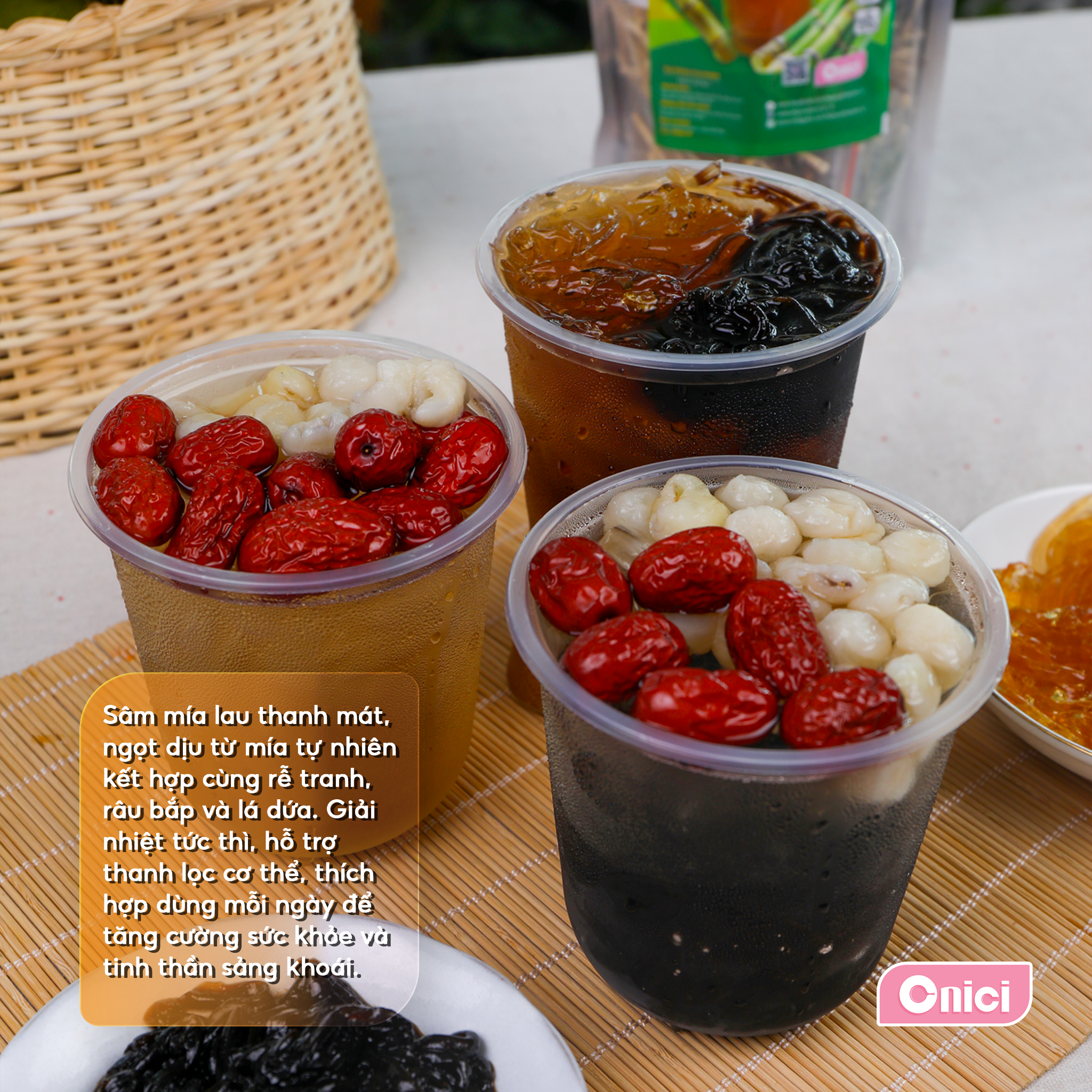 Sâm mía lau Onici Oheasy được nấu từ nhiều loại thảo mộc như mía lau, râu bắp, mã đề, long nhãn… Mỗi thứ một tí, kết hợp lại tạo nên một thức uống thanh mát, giải nhiệt cực kỳ hiệu quả. Uống vào là thấy sảng khoái cả người luôn.