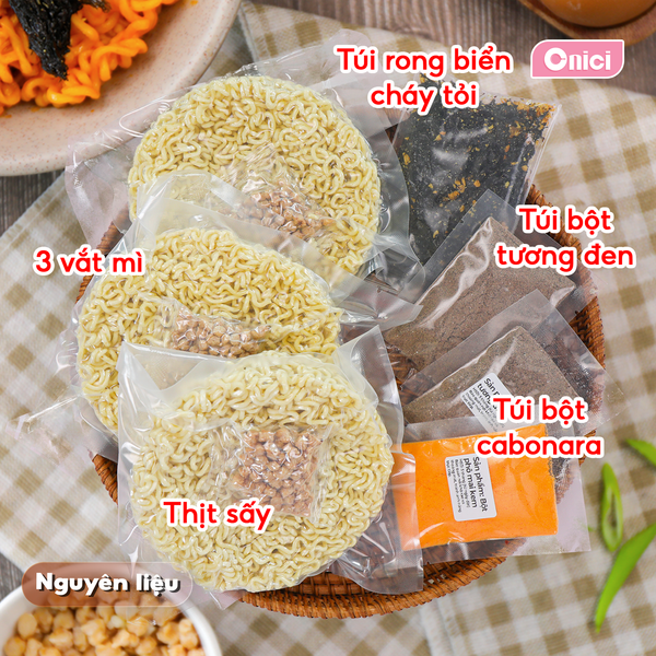 - Set mì trộn quắn quéo Onici Oheasy gồm 3 vắt mì chất lượng, 2 vị sốt: carbonara cay béo và tương đen đậm đà.